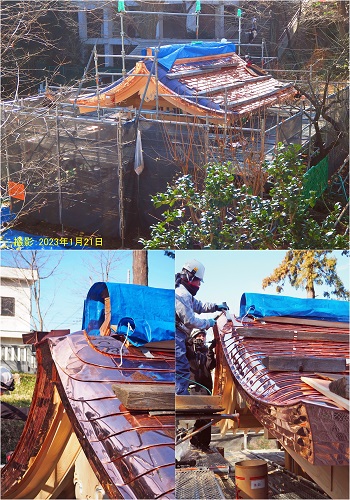 ・東京都町田市本町田 ・令和5年2023年1月21日撮影 ・手水舎移転新築工事 ・屋根銅板葺き進行 ・老朽化対応と手水新形式 ・令和5年2023年3月 竣工予定